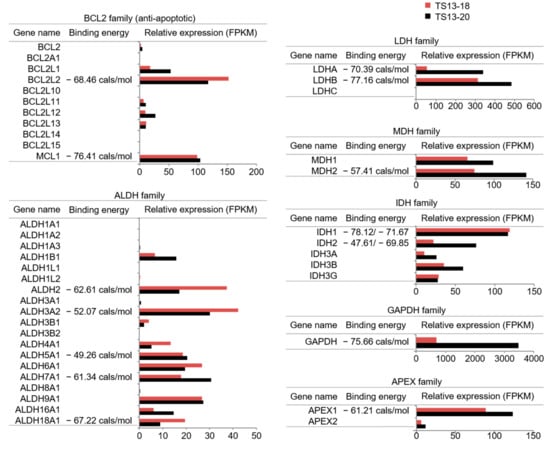 Gossypol can bind to various dehydrogenases as well as to BCL2 family proteins. The expression levels of potential gossypol target genes were obtained from previously published RNA-sequencing data of TS13-2- and TS13-18 []. Binding energies were calculated for docking structures of gossypol–BCL2 family (BCL2L2 and MCL1), gossypol–dehydrogenases (ALDH, LDH, MDH, IDH, and GAPDH), and gossypol–APEX using the MM/GBSA method. The Protein Data Bank entries used for the docking and MM/GBSA binding energy calculations were 4CIM (BCL2L2), 4OQ5 (MCL1), 1O04 (ALDH2), 4QGK (ALDH3A2), 2W8N (ALDH5A1), 4ZVX (ALDH7A1), 2H5G (ALDH18A1), 4ZVV (LDHA) 1I0Z (LDHB), 2DFD (MDH2), 5DE1 (IDH1), 4JA8 (IDH2), 1U8F (GAPDH), and 5DFI (APEX1), respectively. FPKM; Fragments per kilobase of transcript per million.