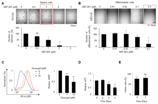 Cultures of patient-derived TS13-18 and TS13-20 cells has been described previously []. Briefly, both cell lines were established directly from male patients with IDH1 (Isocitrate dehydrogenase 1) wild-type primary World Health Organization (WHO) grade 4 glioblastomata. While the MGMT (O6-alkylguanine DNA alkyltransferase) gene promoter in TS13-18 was unmethylated, the same promoter in TS13-20 was methylated. Glioblastoma TS cells and their differentiated counterparts were cultured as previously described []. Briefly, TS cells were cultured in growth media at 37 °C in a 5% CO2 humidified incubator. The differentiated counterparts were cultured under the same conditions but supplemented with 10% heat-inactivated fetal bovine serum (FBS; #SH30084.03; HyClone, Logan, UT, USA). Growth media consisted of DMEM/F-12 (#10-0900cv; HyClone) supplemented with 1× B27 (#17504-044; Invitrogen, San Diego, CA, USA), 20 ng/mL basic fibroblast growth factor (#E0291; Sigma–Aldrich, St. Louis, MO, USA), 20 ng/mL epidermal growth factor (#E9644; Sigma–Aldrich), and 1% penicillin-streptomycin (#15140-122; Invitrogen). Gossypol (#G8761) and TMZ (#T2577) were purchased from Sigma–Aldrich and ABT-263 (#A3007) was obtained from APExBIO (Boston, MA, USA).