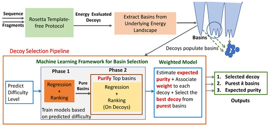 Illustration: Pipeline of ML-Select followed by a weighted model to first select pure basins and then select an individual decoy for prediction.
