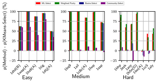 Figure 2 provides a visual comparison of energy-based and energy-less, unsupervised and supervised decoy selection methods, namely Basins-Select, ML-Select, and Community-Select, against the baseline method KMeans-Select on non-CASP dataset shown in Table 1. Specifically, we show how each method fares against KMeans-Select by subtracting the purity achieved by KMeans-Select from each method’s purity. Results are presented for each category (easy, medium, and hard), separately, in the left, middle, and right panels, respectively, in Figure 2. Weighted Purity, described in Section 2, is also shown.