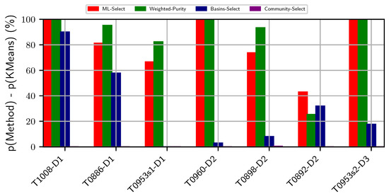 Visualization of two supervised and two unsupervised decoy selection strategies on the critical assessment of structure prediction targets. The y-axis tracks the difference in purity of the top basin predicted by each method with the purity of the top (largest) cluster obtained by KMeans-Select. The x-axis tracks the protein data bank entry id of each target protein. Color-coding is used to distinguish the different methods under comparison.
