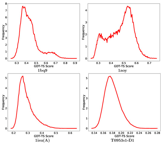 Distribution of global distance test-total score scores for one medium difficulty protein under PDB entry 1bq9, two hard proteins under PDB entries 1aoy and 1isu(A) from the non-CASP targets and T0953s1D1 from the CASP targets. The x-axis tracks GDT-TS scores. The y-axis tracks frequency of decoys with corresponding GDT-TS scores. The frequency has been scaled to a range [1–10] by dividing all frequencies by the minimum frequency.