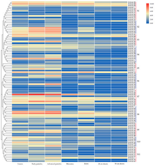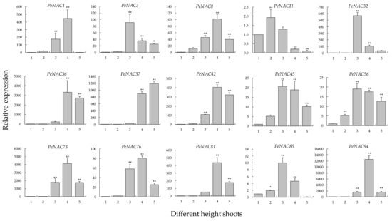 2.5. Expression Patterns of PeNACs Based on Transcriptome Data of Moso Bamboo