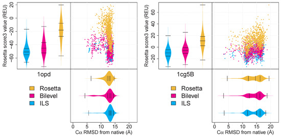 Examples of targets for which native-like states are rarely sampled (data from [5]). The top right panel in each set of plots is a scatterplot of Rosetta score values in Rosetta energy units (REU) versus C RMSD from the native structure. Kernel density beanplots for scores and RMSD values are shown next to the relevant axes. Data are shown for targets 1opd and 1cg5B, for Rosetta and our bilevel and ILS protocols (described in Section 1.2 and [5]), for 1000 low-resolution decoys each. It can be seen that the most frequently sampled states for these targets are found at a considerable distance from the native. The presence of a handful of decoys relatively near the native state indicates that these structures are compatible with the fragment sets used, and that it might be possible to increase the frequency with which these solutions are obtained.