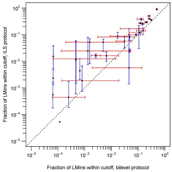 Log-log plot of the fractions of all accessed LMin structures that were within a C RMSD of 4 Å from the native structure, comparing the bilevel and ILS protocols. The ILS protocol typically accesses native-like LMins at a higher rate than the bilevel protocol, although the opposite is true for a few targets. Median values (n = 100 runs) for targets in our test set are plotted as black points, and interquartile ranges (IQRs) are represented by error bars (bilevel IQR in red, ILS IQR in blue). An IQR is plotted only if the first quartile is non-zero, and medians are plotted only if values for both protocols are non-zero. A dashed line of unit slope is drawn to aid interpretation. An extended form of these data for all targets is given in the Supplementary Materials (Tables S3 and S4).