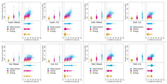 Although there are no strong differences in 5th percentile RMSD among the three archivers, differences are much more pronounced when considering the full distribution of RMSD values. Figure 4 shows score and RMSD data (following Stage 3 of our protocols) for some of the targets in Table 1. The data in this figure also compare score and RMSD trends observed when using each of the three archiving strategies. Corresponding data for all targets can be found on Zenodo at https://zenodo.org/record/3356897. Our protocols can differ in the rate at which native-like LMins are accessed (Section 2.2). It can be seen that, for any given archiver, a relative increase in the rate at which a given sampling protocol accessed native-like LMins translates into a larger number of near-native decoys being retained. Due to the fact that the ER archiver keeps a (mostly) random sample of the LMins encountered by the sampling protocol over the course of a run, the distribution of decoys obtained by this archiver represents the distribution of all LMins, to some extent. Thus, an increase in the number of native-like solutions retained by this archiver between the bilevel and ILS protocols likely indicates that a larger number of such minima were encountered. Comparing the bilevel and ILS protocols, we see that a higher density of native-like decoys in the ER archiver associates with a corresponding increase in the density of such decoys in the other two archivers as well, and the SRCM and energy-based archivers tend to retain a greater number of native-like decoys.