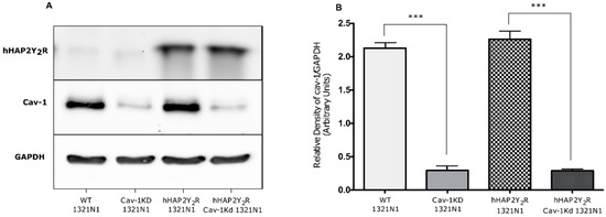 shRNA-mediated knockdown of caveolin-1 expression of 1321N1 astrocytoma cells. (A) Immunoblot analysis of hHAP2Y2R, caveolin-1 (Cav-1), and GAPDH (control) expression in serum-starved wild-type (WT) 1321N1 cells (lane 1), human 1321N1 cells expressing hHAP2Y2R (hHAP2Y2R 1321N1 cells) (lane 3), or cells infected with Cav-1 shRNA lentiviral particles (lanes 2 and 4; Cav-1 knockdown (KD)). (B) Densitometric analysis of immunoblots indicates the level of Cav-1 normalized to GAPDH expression. Results are presented as the means ± S.E.M. (n = 3; *** p < 0.001 as determined by one-way ANOVA).