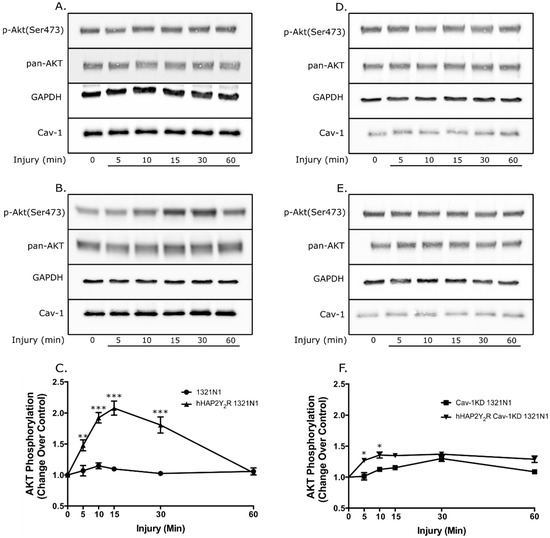 Cav-1 KD reduced the P2Y2R-mediated Akt phosphorylation after mechanical injury. Post-injury Akt phosphorylation time course of (A–C) Cav-1-expressing and (D–F) Cav-1 KD 1321N1 cell lines. Immunoblots for (A) Cav-1-expressing WT-1321N1 and (B) Cav-1/hHAP2Y2R-expressing 1321N1 cells. Densitometric analysis of the latter immunoblots is shown in (C), revealing the post-injury hHAP2Y2R-mediated increased Akt activity. Immunoblots for (D) Cav-1 KD WT-1321N1 and (E) Cav-1 KD/hHAP2Y2R-expressing 1321N1 cells. Densitometric analysis of the latter immunoblots is shown in (F), revealing the diminished post-injury hHAP2Y2R-mediated increased Akt activity in Cav-1 KD 1321N1 cells. Cells were lysed and Akt phosphorylation on Ser473 and total Akt, Cav-1, and GAPDH (control) expression in equal amounts of protein were determined by Western blot analysis. Immunoblots are representative of at least three independent experiments. In panels C and F, Akt phosphorylation on Ser473 was normalized using the formula: phosphorylated Akt/(pan Akt + GAPDH) and expressed as a percentage of untreated controls at 0 min. Values represent the means ± S.E.M. (n = 4), where * p < 0.05, ** p < 0.01, and *** p < 0.001 (one-way ANOVA) represent statistically significant differences between P2Y2R-devoid and P2Y2R-expressing 1321N1 cells.