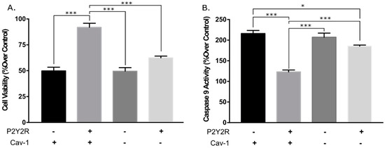 It has been shown that P2Y2R signaling responses in 1321N1 astrocytoma cells mediate its cell survival and anti-apoptotic action upon mechanical injury [10]. To further investigate the role of Cav-1 in the P2Y2R-mediated pro-survival and antiapoptotic actions, the aforementioned 1321N1 astrocytoma cell lines were subjected to mechanical injury, and cell viability and caspase-9 activity were measured 24 h post injury. Results showed that in Cav-1-positive 1321N1 cells the expression of the hHAP2Y2R led to a significant increase in cell viability of ~92%, compared with ~49% in WT (P2Y2R devoid) 1321N1 cells (Figure 4A). In turn, Cav-1 KD significantly diminished the P2Y2R-elicited cell viability increase after mechanical injury from ~92% to ~62% (Figure 3A). Moreover, in Cav-1-positive 1321N1 cells the expression of the P2Y2R exerted an anti-apoptotic action as revealed by a significant decrease in caspase-9 activity from ~216% to ~123%. This anti-apoptotic action (or decreased caspase-9 activity) was significantly diminished in Cav-1 KD expressing the P2Y2R in 1321N1 cells (Figure 4B). Collectively, the data demonstrate that Cav-1 is necessary for the P2Y2R-mediated signaling, pro-survival, and anti-apoptotic actions after mechanical injury in human 1321N astrocytoma cells. Hence, these diminished pathophysiological responses are due to the diminished cell signaling of the P2Y2R after diminished Cav-1 expression.