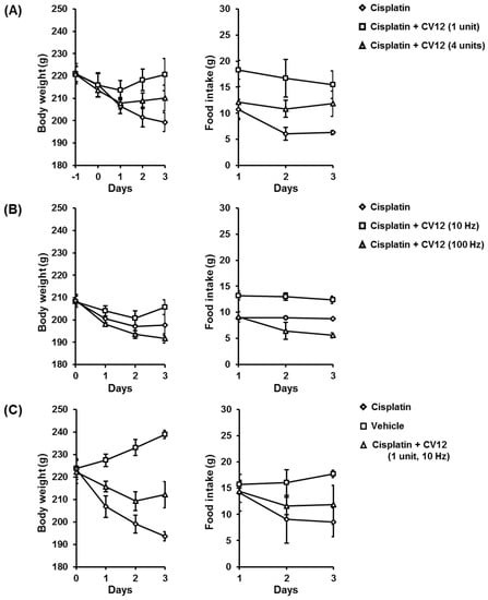 3.1. Evaluation of the Optimal EA Condition to Alleviate Cisplatin-Induced Anorexia