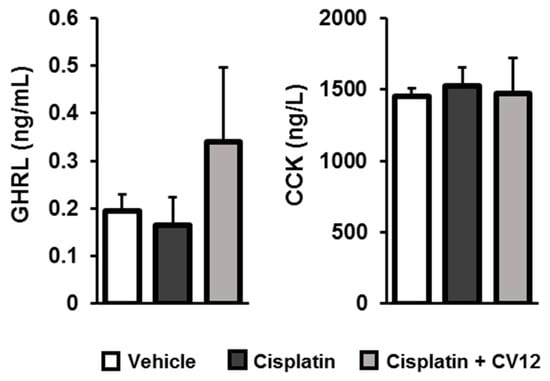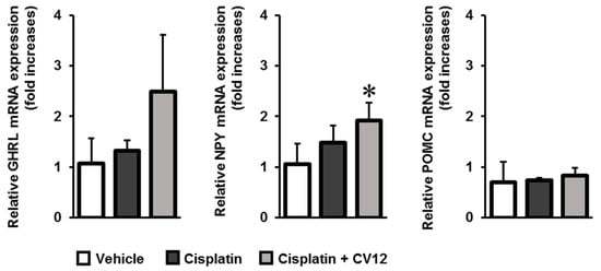 - Yoshimura, M.; Matsuura, T.; Ohkubo, J.; Ohno, M.; Maruyama, T.; Ishikura, T.; Hashimoto, H.; Kakuma, T.; Yoshimatsu, H.; Terawaki, K.; et al. The gene expression of the hypothalamic feeding-regulating peptides in cisplatin-induced anorexic rats. Peptides 2013, 46, 13–19. [Google Scholar] [CrossRef]
