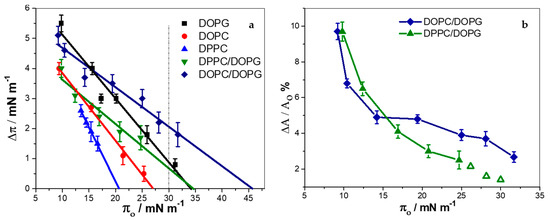∆π depends on the amount of peptide incorporated, on the rearrangement caused by the peptide on the surrounding lipids, and on the stiffness of the monolayer (i.e., the surface pressure response of the film, due to a change in the area per lipid). In order to better compare the effect of peptide incorporation into DOPC/DOPG and DPPC/DOPG films (which depict different stiffness), we estimated the change in the mean molecular area occupied by the lipids not affected by the peptide upon incorporation of the peptide, ∆A. This was calculated with the mean molecular areas obtained from the compression isotherms of the pure lipids at πo and at πf, as detailed in supplementary materials (Figure S6) [16]. Figure 1b shows the percentage of area change, ∆A/A0% (A0 is the mean molecular area of the lipids at πo) as a function of π0. The open symbols were calculated with the data of Δπ extrapolated from the linear fitting in Figure 1a. Changes in the area observed in monolayers of DOPC/DOPG at high compactions were larger than in DPPC/DOPG monolayers, and thus, a larger amount of KR9C incorporated, and/or a larger perturbation was observed in these fluid films, compared to the more rigid DPPC/DOPG films.