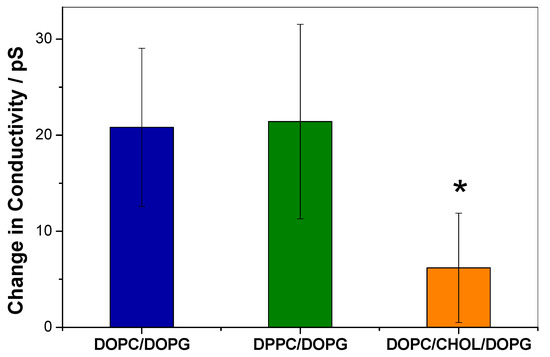 Increase in conductivity of black lipid membranes (BLMs) of the indicated compositions after addition of 1 µM KR9C. ANOVA test indicated that there is at least one different data with a 5% confidence (α = 0.05); the obtained * p-value was 0.01. The asterisk denotes a statistically significant difference between 1,2-dioleoyl-sn-glycero-3-phosphocholine (DOPC)/ cholesterol (CHOL)/DOPG and DOPC/DOPG and DPPC/DOP, according to the Tukey test