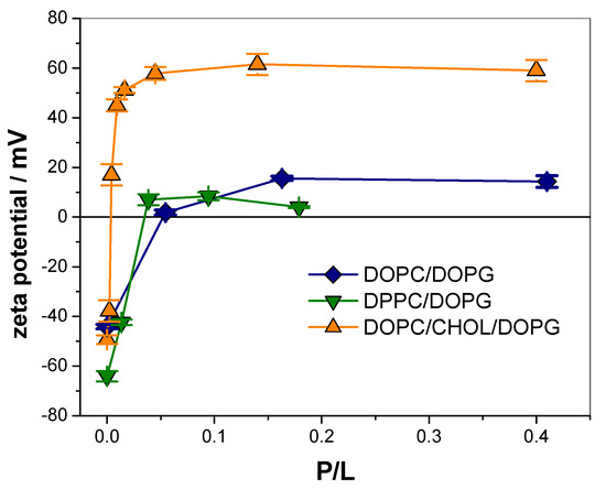 For the z potential and dynamic light scattering (DLS) measurements, the 0.3 mM lipid dispersion was diluted to a final concentration of 0.12 mM. Then, an appropriate volume of a stock solution of the peptide was added to 100 µL of this dilution to achieve the desired peptide to lipid molar ratio (P/L), and incubated for 1 h. The z-potential determinations were performed by means of Henry’s equation, subjecting aliquots of 100 µL of liposomes and peptide to an electric field and determining electrophoretic mobility with Z-sizer SZ-100-Z equipment (Horiba, Ltd., Kyoto, Japan).