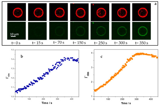 The kinetics of adsorption of the peptide on the membranes was followed with the fluorescently marked peptide 5-FAM-KR9C using GUVs and confocal microscopy. GUVs contained 0.5% Rho-PE as a fluorescent probe and were between 5 and 20 µm in diameter. At least 16–20 GUVs of each composition were analyzed, and Figure 5a shows representative images. The time at which fluorescence of 5-FAM-KR9C was detected at the vesicle’s rim was variable, since it depended on peptide diffusion. We determined the fluorescence outside each GUV over time and normalized the fluorescence at the rim with the fluorescence outside it at each time, Γrim = rim’s fluorescence/fluorescence outside the GUV. Γrim gives an insight of the excess peptide at or/and inside the membrane in relation to the bulk peptide concentration (possible changes in the fluorescent emission of 5-FAM, due to changes in the environment would also affect Γrim). 1 or 2.5 μM peptide was added, corresponding to P/L ratios greater than 1 where ζ has already reached a plateau (Figure 4). Figure 5b,c show the typical profiles for Γrim as a function of time for GUVs of DOPC/DOPG and DOPC/CHOL/DOPG, respectively. The fluorescence increased over time, until it reached a constant value. GUVs composed of DPPC/DOPG did not reach a plateau, they were unstable upon peptide addition and exploded a minute after the peptide concentration outside the GUV reached a constant value, being the maximal Γrim value of about 2. Therefore, this composition was excluded from this set of experiments. Himeno et al. observed the formation of pores in DOPG/DPPC mixtures that was suppressed by the addition of salt, due to the screening of the electric charge of DOPG [42]. Contrary to their results, we observed that GUVs became more unstable when the peptide was added, although a partial neutralization was observed (see Figure 3). Therefore, the instability induced by the peptide in DPPC/DOPG membranes was not related to an electrostatic effect. It may be related to the increase in DPPC-rich regions, which are expected to be rigid, and thus, not able to deform easily when the peptide incorporated.