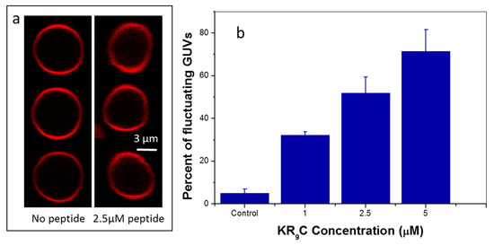We next classified GUVs as “fluctuating” or “not-fluctuating” and calculated the population of fluctuating vesicles [28]. Figure 6b shows that the percentage of fluctuating GUVs increased in the presence of the CPP, indicating that the energy cost for a shape change decreased when KR9C was added.