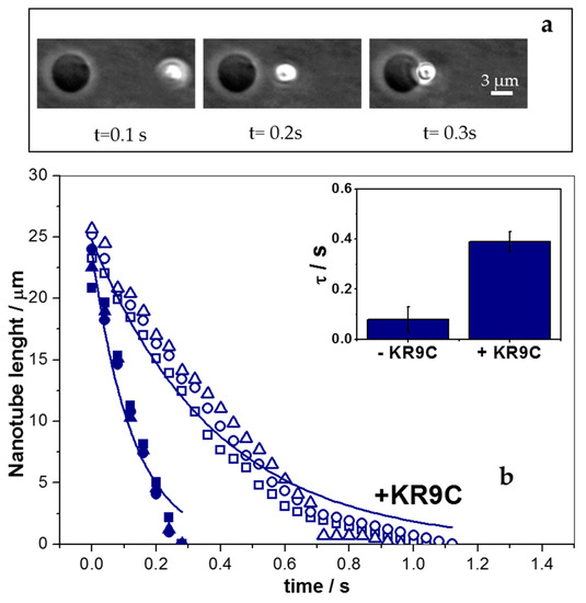To quantify the elasticity of the membrane upon undulations, we applied mechanical stress to the GUVs by means of optical tweezers. Membrane nano-tubes were generated from GUVs before and after the addition of low peptide concentrations (0.25 μM) and registered the retraction process after the trap was turned off. Figure 7a shows a temporal image sequence of the retraction process, from which nano-tube length was obtained. These data were plotted, as shown in Figure 7b, and fitted in order to obtain the characteristic time for relaxation with an equation that neglects inertial terms [43]: . Here, L0 and L are the initial nano-tube length and its temporal value, respectively. The values for R-square for the fitting were within 0.91 and 0.98, being lower for the experiments in the absence of peptide. The fitting was better at high nano-tube lengths than at the end of the experiment (see the two examples in Figure 7b). This could be related to bead-vesicle interactions that were not considered in the fitting model.