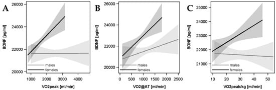 The following are available online at https://www.mdpi.com/2218-273X/9/10/630/s1, Table S1: Variance inflation factors for the different model, Figure S1: BDNF distribution in males and females, Figure S2: Fit diagnostics for the association between BDNF and VO2peak in males, Figure S3: Fit diagnostics for the association between BDNF and VO2peak in females, Figure S4: Fit diagnostics for the association between BDNF and VO2peak/kg in males, Figure S5: Fit diagnostics for the association between BDNF and VO2peak/kg in females, Figure S6: Fit diagnostics for the association between BDNF and VO2@AT in males, Figure S7: Fit diagnostics for the association between BDNF and VO2@AT in females, Figure S8: Fit diagnostics for the association between BDNF and VO2peak in males with additional adjustment for platelets, Figure S9: Fit diagnostics for the association between BDNF and VO2peak in females with additional adjustment for platelets, Figure S10: Fit diagnostics for the association between BDNF and VO2peak/kg in males with additional adjustment for platelets, Figure S11: Fit diagnostics for the association between BDNF and VO2peak/kg in females with additional adjustment for platelets, Figure S12: Fit diagnostics for the association between BDNF and VO2@AT in males with additional adjustment for platelets, Figure S13: Fit diagnostics for the association between BDNF and VO2@AT in females with additional adjustment for platelets.