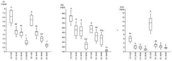| Treatment | Depth (cm) | TG (mg/g) | EEG (μg/g) | WSA (dg/g) | Macro-Aggregates (%) |