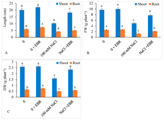 Ameliorating role of 24-epibrassinolide (EBR) on (A) length, (B) fresh weight, and (C) dry weight of shoot and root under NaCl toxicity in soybean. Data presented are the means ± SE (n = 5) and significant difference calculated between the means at p ≤ 0.05 using the Duncan’s multiple range test.