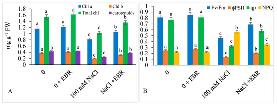 Effect of 24-epibrassinolide (EBR) on (A) pigment content and (B) chlorophyll fluorescence parameters under NaCl toxicity in soybean. Data presented are the means ± SE (n = 5) and significant difference between the means calculated at p ≤ 0.05 using the Duncan’s multiple range test.