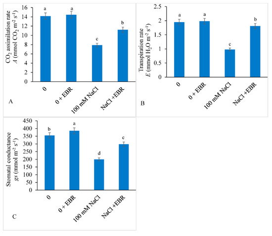 Decreased CO2 assimilation rate (A), transpiration rate (E), and stomatal conductance (gs) with saline stress are analogous to the findings of Parveen and Ashraf [76] in Zea mays. Salt-stressed plants exhibited reduced leaf gas exchange parameters similar to what has been documented by Fariduddin et al. [72] and Wang et al. [77] in Cucumis sativus, and Hayat et al. [56] and Mahmood et al. [78] in Vigna radiata. Salt stress is believed to induce alteration in enzyme activities which leads to protein dysfunction, which might be the main reason for decreased leaf gas exchange parameters. However, supplementation of EBR enhanced the leaf gas exchange attributes as has been already investigated by Hu et al. [79] in Capsicum annuum and Lima and Lobato [69] in cowpea. It has been reported that EBR significantly enhanced the CO2 assimilation rate [80] and Rubisco enzyme activity [42], thereby increasing photosynthetic activity, which in turn increased plant growth and development.