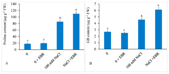 The NaCl stressed soybean plants showed enhanced proline by 4.68-fold and GB by 1.70-fold compared to those in the control plants. External application of EBR to NaCl stressed plants further elevated the accumulation of proline and GB content by 1.28-fold and 1.33-fold, respectively, relative to those in salt-stressed plants not treated with EBR (Figure 4A,B).
