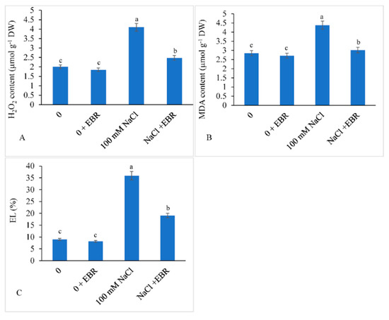 The soybean plants treated with NaCl showed enhanced H2O2 by 1.95-fold, MDA by 1.53-fold, and EL by 3.99-fold relative to those in the control plants. Salt-stressed plants supplied with EBR showed less accumulation by 1.08-fold, 1.05-fold, and 2.12-fold in H2O2, MDA, and EL over the controls (Figure 5A–C).
