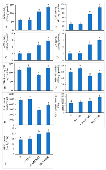 Saline stress decreased AsA content by 39.58% and increased GSH by 23.17% and GSSG by 39.38% compared with the controls (Figure 6G–I). Salt-treated plants supplied with EBR increased the AsA, GSH, and GSSG by 31.03%, 33.66%, and 6.71% relative to those in salt-stressed plants supplied with no EBR.