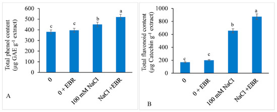 Saline stress increased the total phenol content by 18.42% and total flavonoid content by 285.29% relative to the control. Exogenously supplied EBR further enhanced the total phenol and total flavonoid contents by 15.55% and 33.12%, respectively, over controls, i.e., salt treated plants which were not fed with EBR (Figure 8A,B).