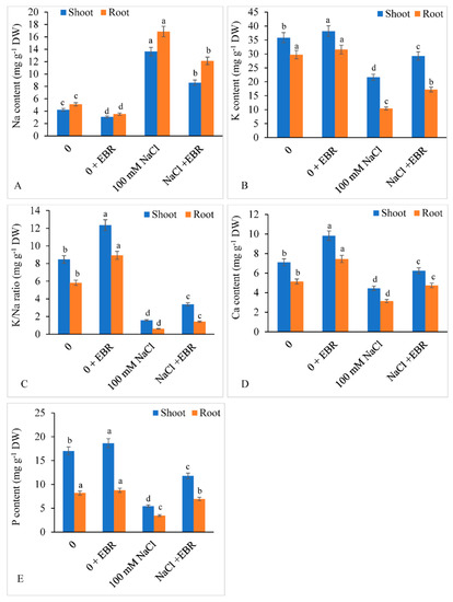 Effect of 24-epibrassinolide (EBR) on shoot and root mineral contents (A) Na content, (B) K content, (C) K/Na ratio, (D) Ca content, and (E) P content in soybean plants under NaCl stress. Data presented are the means ± SE (n = 5) and significant difference between the means calculated at p ≤ 0.05 using the Duncan’s multiple range test.