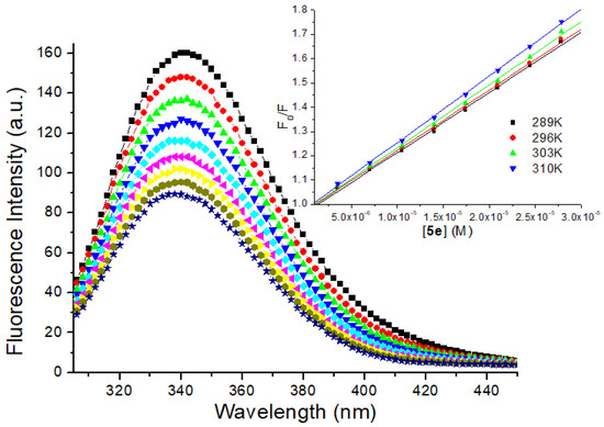 It is very well known that two main different mechanisms account for the interaction fluorophore/quencher (e.g., serum albumin/ligand): dynamic and/or static process. Dynamic and static quenching can be distinguished by Stern-Volmer analysis (inset in the Figure 4), as well as the known relationship between Stern-Volmer quenching constant (KSV) and bimolecular quenching rate constant (kq) at different temperatures [47,48]. The calculated KSV values are practically the same inside the experimental error (Table 3); however, the kq values are about three orders of magnitude larger than the diffusional collision quenching constant (kdiff ~7.40 × 109 M−1s−1, according to the Smoluchowski-Stokes-Einstein theory at 298 K) [49], indicating that the potential anti-Leishmania amazonensis agent (5e) can interact to HSA via a ground state association (static process).