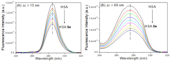 Synchronous fluorescence (SF) spectra for HSA without and in the presence of 5e at (A) Δλ = 15 nm and (B) Δλ = 60 nm. [HSA] = 1.00 × 10−5 M and [5e] = 0.35; 0.70; 1.05; 1.40; 1.74; 2.09; 2.44; and 2.78 × 10−5 M.