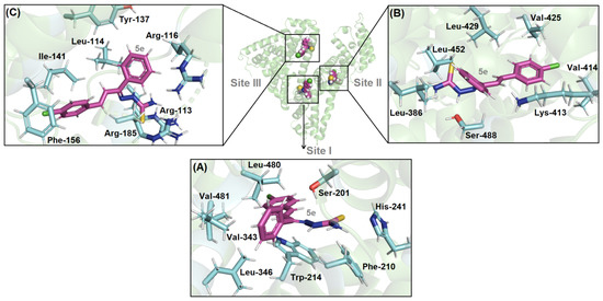 HSA is a globular protein composed of three homologous α-helical domains (I-III), and each domain contains two subdomains (A and B). There are three main binding pockets in the albumin structure: two located in hydrophobic cavities in subdomains IIA and IIIA (sites I and II, respectively) and one located in an external region in subdomain IB (site III) [35]. In order to suggest the main binding site for the compound 5e toward serum albumin’s binding pockets, as well as to offer a molecular description (calculate the possible conformation of each ligand) on the binding ability, molecular docking calculations were carried out with Gold 5.6 program. Figure 8 depicts the best docking pose for the ligand inside the three main possible binding sites (I, II and III), and Table 4 shows the main amino acid residues, which can interact with the potential anti-Leishmania amazonensis agent.