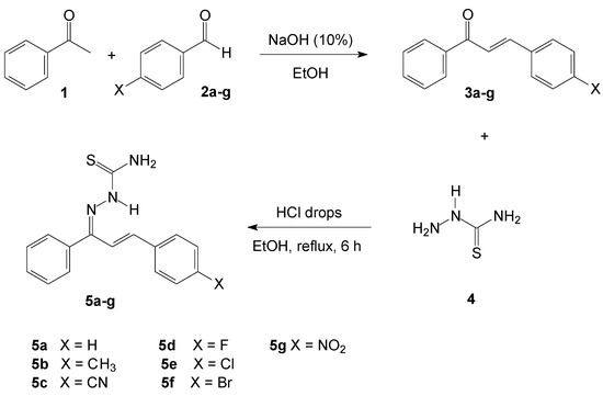A series of seven 1-phenyl-3-(4-X-phenyl)-2-ylprop-2-en-1-one thiosemicarbazones (5a–g) were prepared using an adapted pathway [40] involving substituted chalcones (3a–g) and thiosemicarbazide (4). The substituted chalcones were synthetized by a traditional Claisen-Schmidt condensation reaction [27] using acetophenone (1) and X-benzaldehydes (2a–g) in the presence of NaOH and ethanol. After the purification process with ethanol, it was obtained the synthetic compounds in good yields (75–93%). Then, the chalcone-thiosemicarbazones were obtained from a mixture of previously synthesized substituted chalcones and thiosemicarbazide using a few drops of concentrated HCl and ethanol as a solvent at the reflux temperature within 6 h (Scheme 1). The products were purified by recrystallization from ethanol in reasonable yields (40–75%).