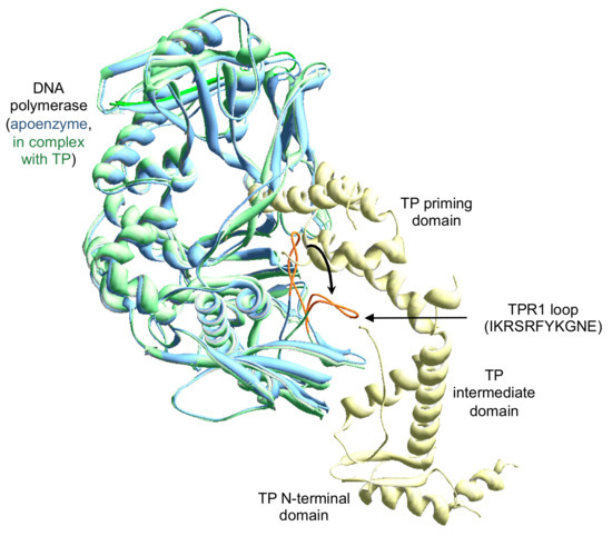 Movement of the Phi29 DNA polymerase TPR1 loop to allow the placement of the terminal protein (TP) priming domain. The figure was made by superimposing the structure of the DNA polymerase complexed with the TP [16] (PDB (Protein Data Base) code 2EX3) on the apo enzyme [10] (PDB code 1XHX). The DNA polymerase from the heterodimer and the apo enzyme are colored in green and blue, respectively. TP is colored in pale yellow. The TPR1 loop is colored in orange, and its sequence (from residue 304 to 314) is indicated.