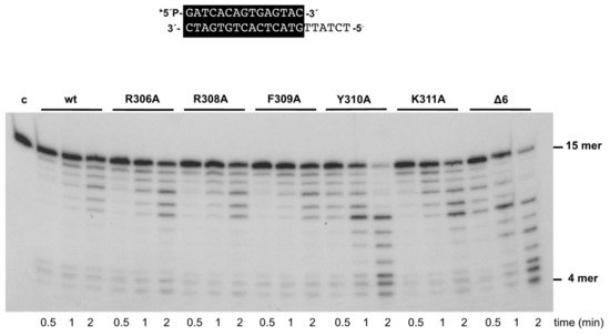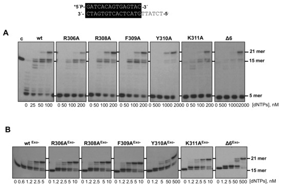 To discern if the unbalanced equilibrium displayed by the mutants was due to their higher exonucleolysis or to a defect in the polymerization activity, the mutants were engineered to include the double mutation D12A/D66A [18] at two catalytic residues of the exonuclease active site to eliminate their exonuclease activity (R306AExo-, R308AExo-, F309AExo-, Y310AExo-, and K311AExo- and Δ6Exo-). As it is shown in Figure 2B, exonuclease deficient DNA polymerase mutants D12A/D66A (wtExo-, used as control of a wild-type polymerization active site), R306AExo-, R308AExo-, F309AExo-, and K311AExo- required a 2.5–5 nM dNTPs to reach the 21mer position, whereas mutants Y310AExo- and Δ6Exo- needed a much higher concentration (50 nM) to fulfill replication of the template strand. Therefore, the polymerization defects observed in these two mutants cannot be attributed to a higher exonucleolytic activity but to impaired polymerization catalysis.