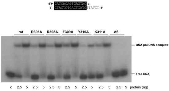 As mentioned above, the 3’–5’ exonuclease activity of the mutant enzymes was apparently higher than that of the wild-type enzyme under those experimental conditions. To study this activity in depth, we performed time-course experiments (see Materials and Methods) using the primer/template molecule as the substrate of the exonuclease activity. As shown in Figure 3 and Table 1, the activity of mutants R306A, R308A, F309A, and K311A was similar to that of the wild-type enzyme, whereas that of mutants Y310A and Δ6 was 1.6- and 1.3-fold higher. Importantly, these variants exhibited a nearly wild-type exonuclease activity on an ssDNA substrate (see Supplementary Figure S1A). In addition, the wild-type and the mutant polymerases hydrolyzed, at a comparable rate, the minimal substrate 5’-p-nitrophenyl ester of thymidine 5’-monophosphate (pNP-TMP; see Materials and Methods and Supplementary Figure S1B), in which the binding at the exonuclease active site is based only on the ligands responsible for the stabilization of the 3’ end of an ssDNA [21], reflecting the integrity of their 3’–5’ exonuclease active site. Altogether, the defects in the polymerization reaction and the higher proficiency of the exonuclease activity of mutants Y310A and Δ6, specifically on a primer/template substrate, could be pointing to a defective stabilization of the primer terminus at their polymerization active site. To test this hypothesis, we analyzed the capacity of the mutant derivatives to efficiently bind a primer-terminus by gel shift assays (as described in Materials and Methods). As shown in Figure 4, the wild-type enzyme gave rise to a single retardation band, that has been interpreted as a stable complex competent for polymerization, in which the primer-terminus is stabilized at the polymerization active site [30]. Mutants displayed a wild-type behavior, with the exception of Δ6, and to a lower extent Y310A, which were impaired in binding dsDNA (7% and 29%, respectively; Figure 4 and Table 1). These results suggest a defective stabilization of the primer terminus at the polymerization active site of mutants Y310A and Δ6, which could account for both their polymerization defects and improved exonuclease activity, due to preferential binding of the primer terminus at the exo site.