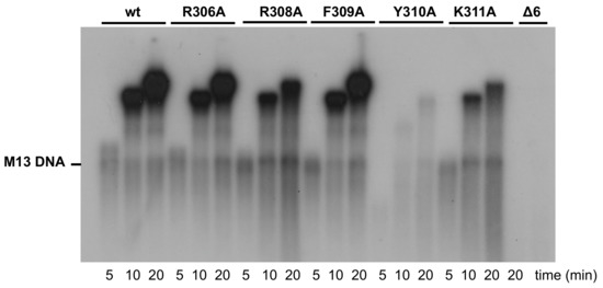 The most distinctive feature exhibited by Phi29 DNA polymerase is its ability to couple processive DNA synthesis to strand displacement, a unique property that allows the enzyme to perform the viral replication from a single DNA binding event in the absence of accessory processivity factors and helicases [9]. Thus, to analyze whether the changes introduced in the DNA polymerase have an effect in processive DNA synthesis coupled to strand displacement, we performed a DNA-primed M13 replication assay (see Materials and Methods), wherein an oligonucleotide was hybridized to the circular M13 ssDNA molecule, and the Phi29 DNA polymerase starts DNA replication from the 3’-OH end of the hybridized oligonucleotide. The first replication round does not require strand displacement, but when it is completed, the polymerase encounters the 5’ end of the primer, requiring active strand displacement to continue DNA synthesis. As shown in Figure 5 and Table 1, except for mutant Δ6 that did not give rise to detectable replication products, the rest of the polymerase derivatives were able to couple processive replication to strand displacement as they yielded replication products longer than the unit length (7 kb). Whereas the replication efficiency displayed by mutants R306A and F309A was similar to that of the wild-type enzyme (92% and 87%, respectively), mutants R308A, Y310A, and K311A replicated the M13 ssDNA 3-, 33-, and 6-fold less efficiently. In the case of mutant Y310A, it also exhibited an impaired replication rate, as deduced from the shorter length of the synthesized products, a fact that could be suggesting a defective processivity. Therefore, to analyze if the processivity of the mutants was affected, we evaluated the chain length distributions during DNA polymerization as a function of the enzyme/DNA ratio. As shown in Supplementary Figure S2, the progressive decrease of the enzyme/DNA ratio did not have any impact on the length of the replication products by the wild-type enzyme, as expected for a processive DNA polymerase. As it can be observed, mutants R306A, R308A, F309A, and K311A also exhibited a processive replication pattern. The high exonuclease activity of mutants Y310A and Δ6, together with their polymerization defects (see above), precluded the evaluation of their processivity under those conditions. Thus, we conducted similar experiments but using the exonuclease deficient versions (Y310AExo- and Δ6Exo-). As shown in Supplementary Figure S3A, both mutants seemed to be slightly affected in the processivity. In fact, in the presence of an excess of activated DNA acting as a challenger, they were able to incorporate only the first nucleotide due to a prompt dissociation of the DNA (Supplementary Figure S3B).