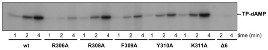 As mentioned above, to start Phi29 DNA replication, the DNA polymerase has to form a heterodimer with a free TP, then the DNA polymerase catalyzes the incorporation of the first nucleotide onto the hydroxyl group of the TP priming residue Ser232 (initiation reaction). Thus, to study the initiation activity of the mutant polymerases, we evaluated their ability to form the initiation product (TP-dAMP) using as template Phi29 TP-DNA. As shown in Figure 6 and Table 1, mutant K311A and, to a lower extent, R308A, were proficient in performing the initiation reaction, whereas mutants R306A, F309A, and Y310A were 13-, 4- and 3-fold less efficient than the wild-type enzyme. As it can be observed, mutant Δ6 showed a negligible ability to catalyze the formation of the initiation product.