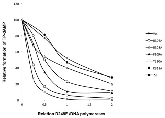 To evaluate if the diminished TP-dAMP complex formation displayed by the mutant enzymes was due to a decreased ability to interact with the TP, we performed interference assays where the wild-type and mutant DNA polymerases compete for a limiting amount of TP with the DNA polymerase mutant D249E that is catalytically inactive but conserves an intact capacity to interact with the TP [25]. As shown in Figure 7, and as expected, when the D249E/wild-type ratio was 1, the formation of the TP-dAMP product was reduced 2-fold. A similar result was obtained with mutants R308A and K311A. Conversely, the initiation reaction displayed by mutants R306A, F309A, Y310A, and Δ6 decreased to less than 50% with respect to that exhibited in the absence of the competitor D249E mutant, a result that indicates an impaired interaction of those mutants with the TP, in agreement with the results obtained in the initiation assays.
