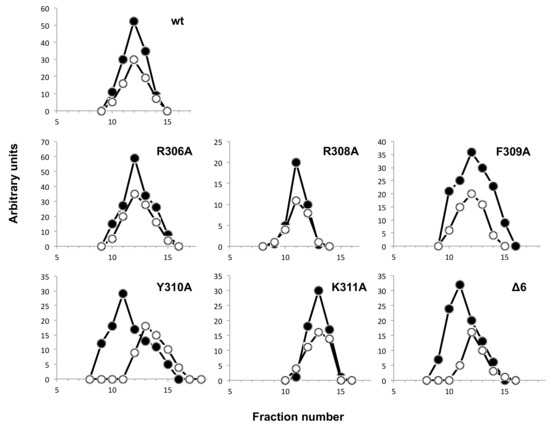 The DNA polymerase/TP interaction was also directly analyzed by glycerol gradient ultracentrifugation (see Materials and Methods). As shown in Figure 8, except for mutants Y310A and Δ6, the wild-type polymerase and the rest of mutant derivatives formed a stable heterodimer with the TP, both proteins sedimenting in the same fractions. Conversely, mutants Y310A and Δ6 and TP eluted as monomers, indicating a deficient TP binding. The low interference ability exhibited by mutants R306A and F309A, together with their capacity to form a stable heterodimer, is suggestive of a non-functional interaction of these mutants with the TP. These results, together with the fact that the mutants Y310A and Δ6 were also the ones most affected in binding the dsDNA, indicate a role of the TPR1 loop and, specifically of the residue Tyr310 not only in binding the DNA but also the TP, the natural primer of the polymerase.