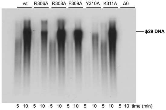 To analyze the role of the mentioned residues belonging to the TPR1 loop of Phi29 DNA polymerase, we changed them into alanine in a non-conservative change, obtaining the DNA polymerase variants R306A, R308A, F309A, Y310A, and K311A. We also obtained the deletion mutant Δ6 lacking residues Arg306-Lys311. The mutant derivatives were overexpressed and purified as described in Materials and Methods, and their activity was analyzed by in vitro biochemical assays.