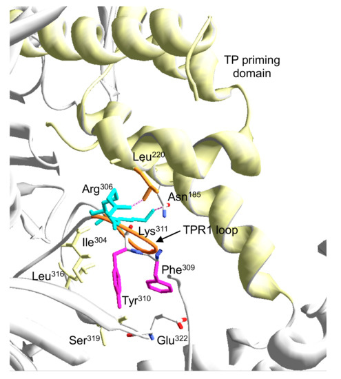 Detailed view of the interaction of TPR1 loop residues with the TP priming domain. The electropositive and aromatic residues of the TPR1 loop studied here are shown in cyan and magenta sticks, respectively. Flexible TPR1 loop regions (residues 305–315) are colored in orange. Terminal protein priming domain is shown in ribbon representation (colored in yellow). For details, see main text.