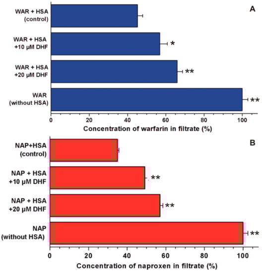 3.2. Effects of DHF on the Fluorescence Signal of Warfarin–HSA Complex