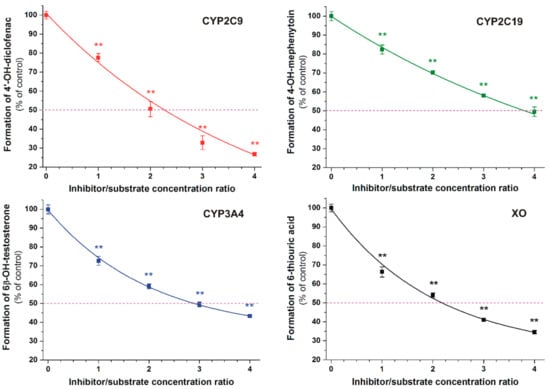 - Shimada, T.; Tanaka, K.; Takenaka, S.; Murayama, N.; Martin, M.V.; Foroozesh, M.K.; Yamazaki, H.; Guengerich, F.P.; Komori, M. Structure-Function Relationships of Inhibition of Human Cytochromes P450 1A1, 1A2, 1B1, 2C9, and 3A4 by 33 Flavonoid Derivatives. Chem. Res. Toxicol. 2010, 23, 1921–1935. [Google Scholar] [CrossRef]