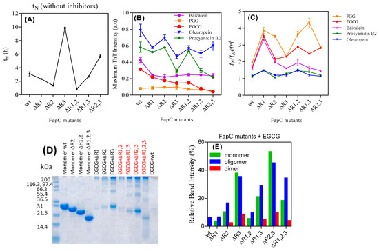 The inhibitory effect of polyphenols on the fibrillation of different FapC mutants. 30 µM of purified mutants of FapC-UK4 was incubated with 100 µM polyphenols in Tris buffer (pH 7.5) with shaking at 37 °C. (A) Absolute lag time (tN) in the absence of polyphenols, (B) normalized maximum ThT emission of different mutants in the presence of inhibitors, (C) relative half time (tN/tN,control); (D) SDS-PAGE of different mutants incubated with EGCG; (E) quantification of monomer, dimer, and oligomer bands from panel e using Image J.