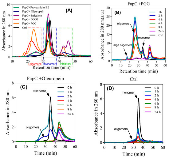 SEC- and SDS-PAGE-based analysis of FapC oligomers formed in the presence of polyphenols. (A) After 1 h incubation, samples were separated by SEC and the indicated oligomer fractions pooled and run on SDS-PAGE; (B–D) time course of oligomer formation: SEC profiles over time of FapC incubated with (B) PGG, (C) oleuropein, and (D) without inhibitor.