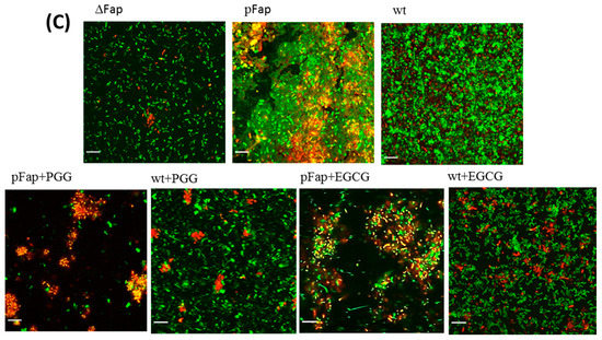 Effect of polyphenols on Pseudomonas biofilm. (A) The amount of biofilm formed in the presence of polyphenols (100 µM) by Pseudomonas overexpressing the fap UK4 operon; (B) correlation between the amount of biofilm and endpoints level of ThT fluorescence for FapC protein incubated with and without polyphenols; (C) confocal microscopy images of pFap and wt incubated with and without 100 µM PGG and EGCG. The bacteria were stained with live/dead stain: Red and green denote dead and live bacteria, respectively, all images were taken with 63× oil objective, scale bars are 10 µm.