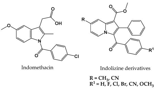 Compounds based on the indolizine scaffold (Figure 1) have been reported to possess a wide spectrum of biological activities. For instance, they have been shown to be able to bind to phospholipase A2, histamine receptors, and calcium channels, which are well-known drug targets [9,10]. In addition, indolizine derivatives were reported to have potential anti-inflammatory and anti-cancer effects [11,12,13]. Figure 1 shows the similar structures of the marketed COX-2 inhibitor indomethacin and the scaffold of the indolizine derivatives.